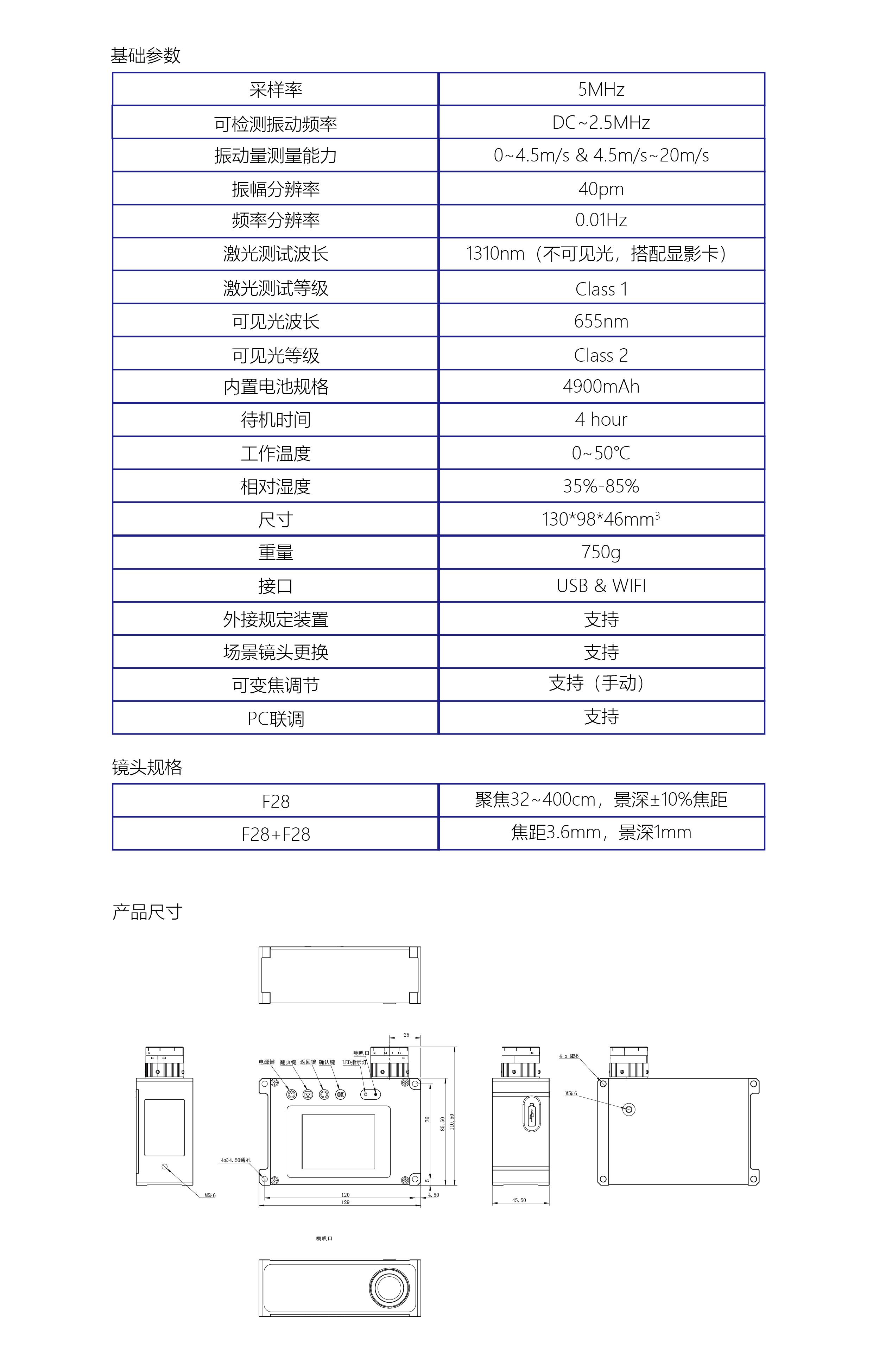 1310nm 測量激光+655nm 紅光指示;體積小、重量輕;含充電電池、可持續(xù)適用4小時(shí)以上;LCD顯示屏;USB充電和通訊接口;無線WIFI連接;DC~2.5MHz測量范圍;配套三角架系統(tǒng);適配全套測量鏡頭組,適合各種場景適用;適合野外場合適用,適合工廠環(huán)境快速測量